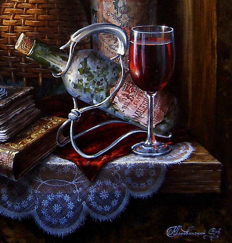 Still Life in a Niche with a Napkin and Antique Bottles